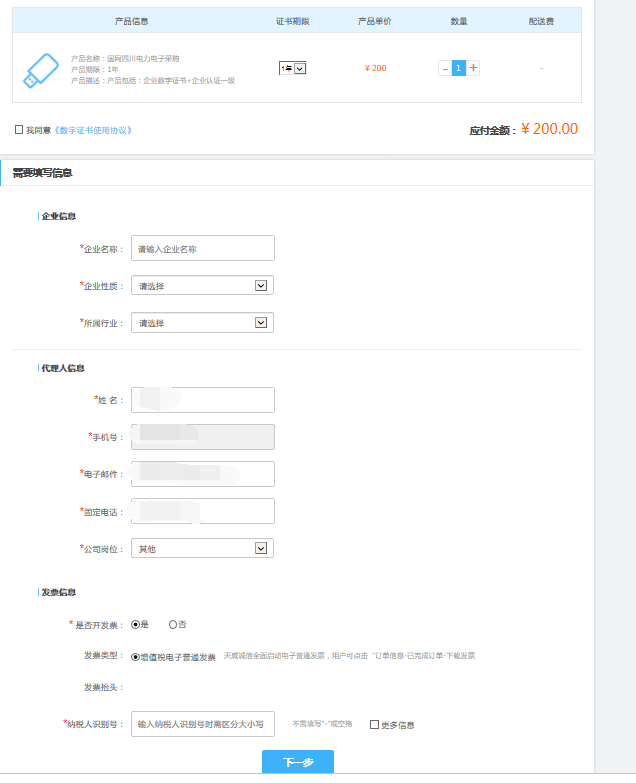 订单注册提交网址:https://ixin.itrus.com.cn/s/gwsc-cg 注册登录进去提交订单并付款 费用是200元一年有限期(办理周期3个工作日)