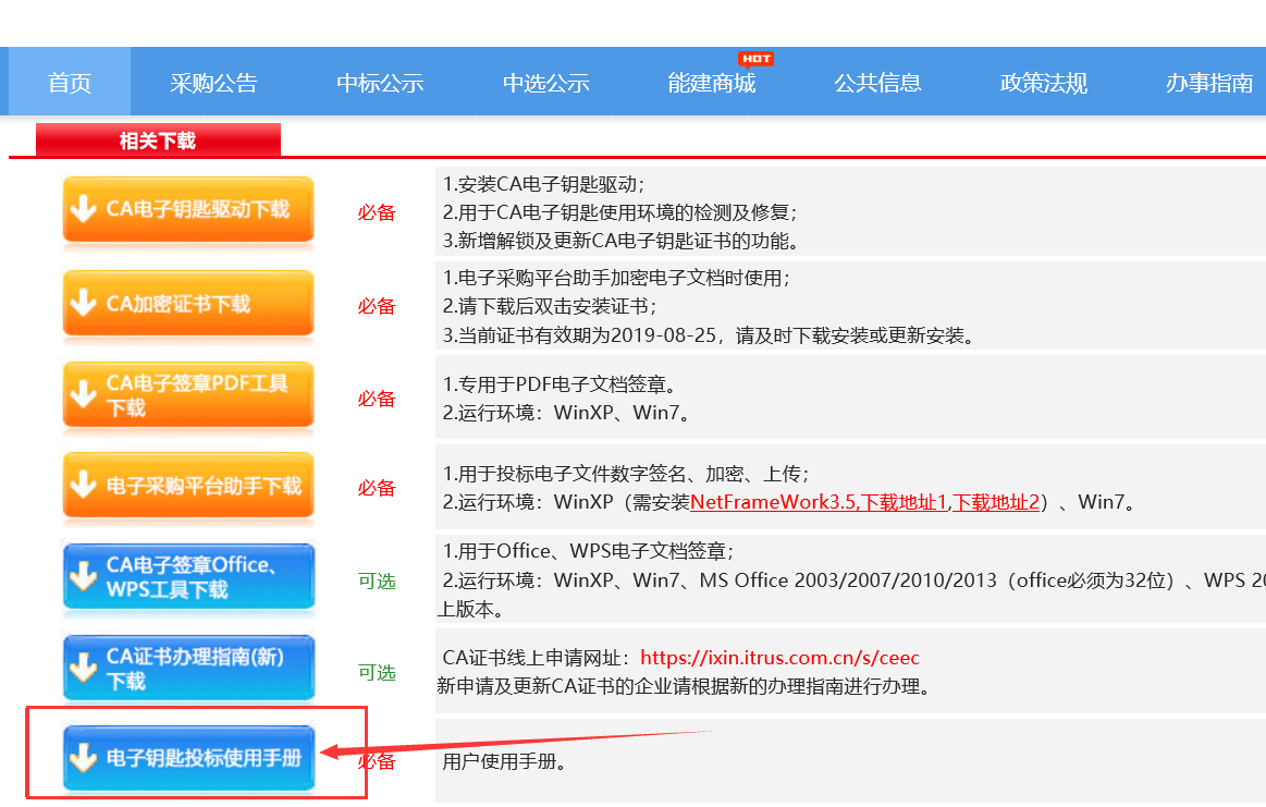点击【CA相关下载及常见问题】后下载【电子钥匙投标使用手册】