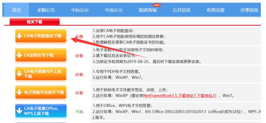 点击【CA相关下载及常见问题】后下载【CA电子钥匙驱动下载】
