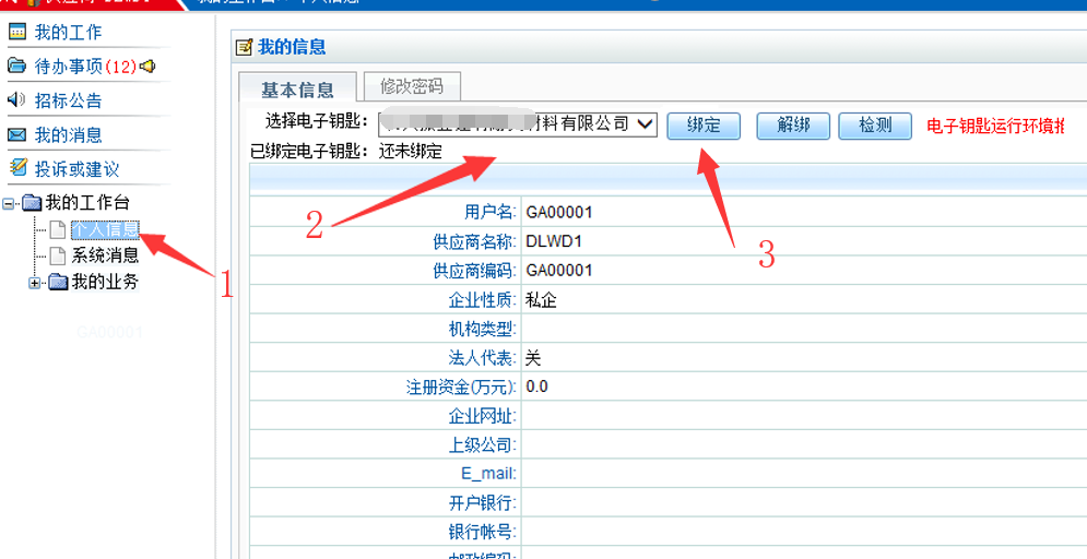 登录后点击【我的工作台】→【个人信息】→【基本信息】→【绑定】