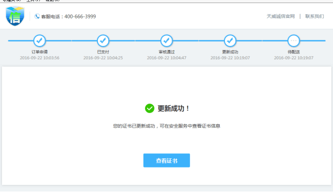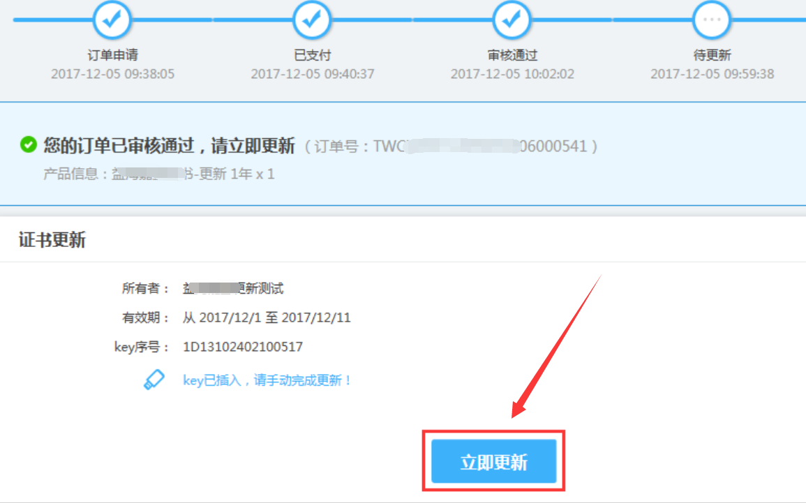 您的订单审核通过后进入【待更新】阶段,请使用【IE浏览器】登录i信平台https://ixin.itrus.com.cn/, 完成证书更新,点击【立即更新】,完成更新,更新过程请不要拔出电子钥匙