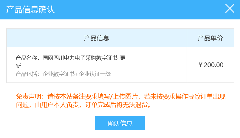 请核实产品名称无误后点击【确认信息】提交续期订单 收费标准:RMB 200元 订单提交后,完成付款,支持微信或支付宝方式完成在线支付