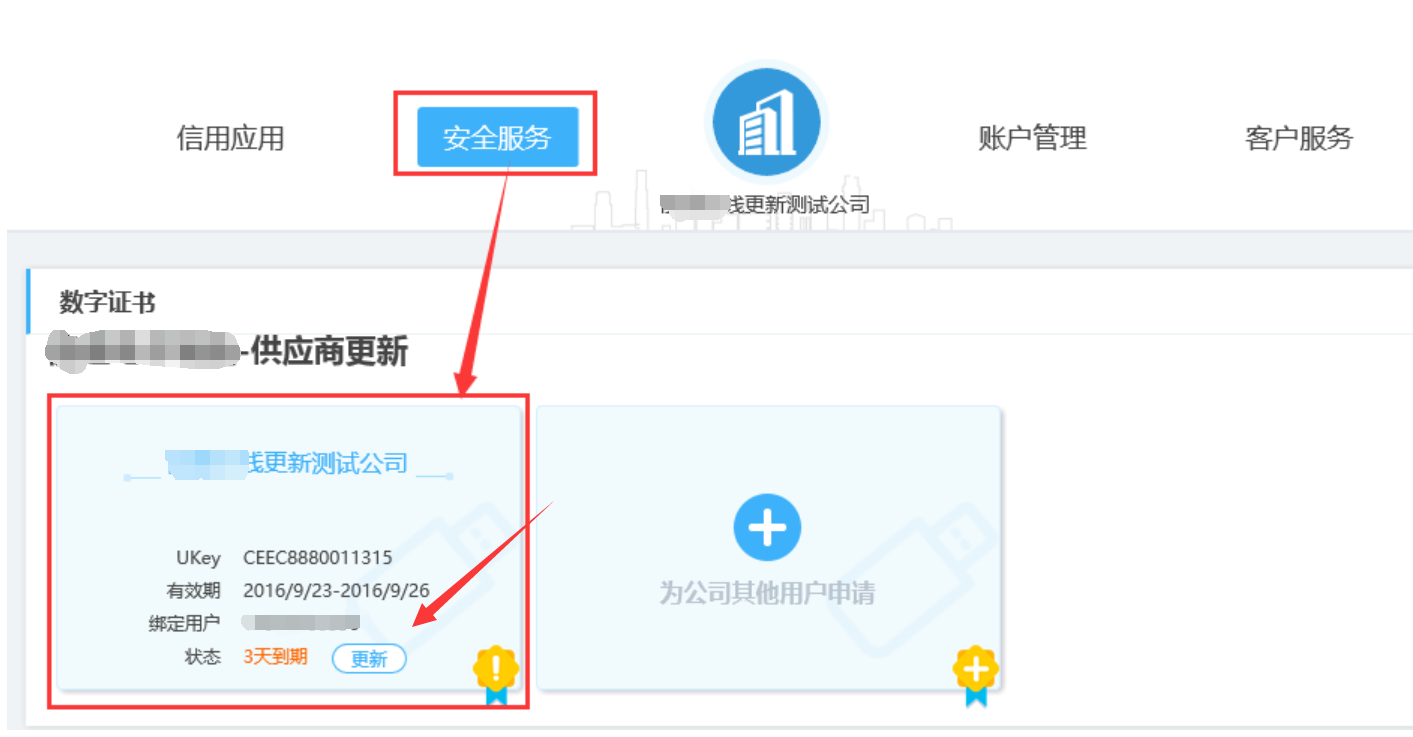 登录成功后,点击【安全服务】后点击【更新】 点击【更新】,进入更新订单提交页面,按照网页提示完成信息填写及订单提交