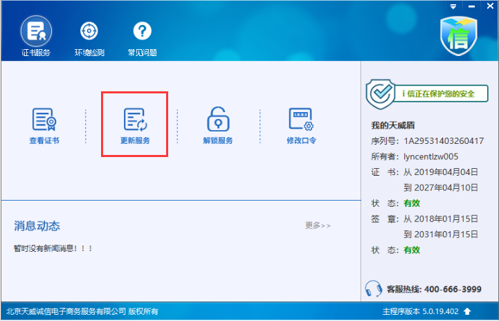打开i信主界面并点击“更新服务”按钮进入更新页面