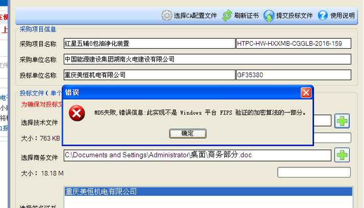 平台助手上次标书文件时,提示MD5失败,错误信息,此实现不是windows平台FIPS验证的加密算法的一部分,报错如下图