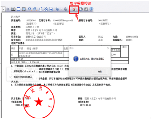 登录联想平台,打开需要签章的文件,点击签章按钮,输入密码生成电子章,点击弹屏“签章已完成,请关闭签章窗口”确定按钮,关闭签章文件