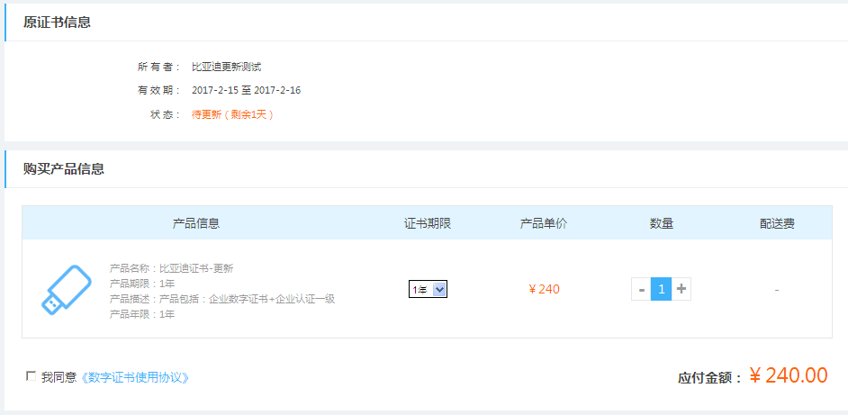 点击更新证书按钮,供应商手动完成证书更新:确认当前需要更新的证书信息,点击立即更新