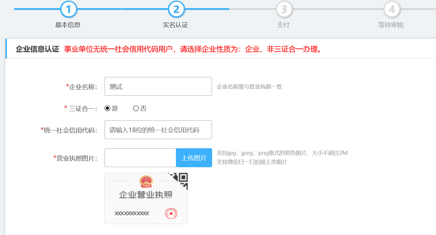 上传营业执照和《企业实名认证申请授权书》,授权书需加盖企业实体公章
