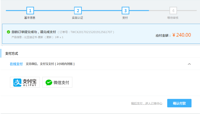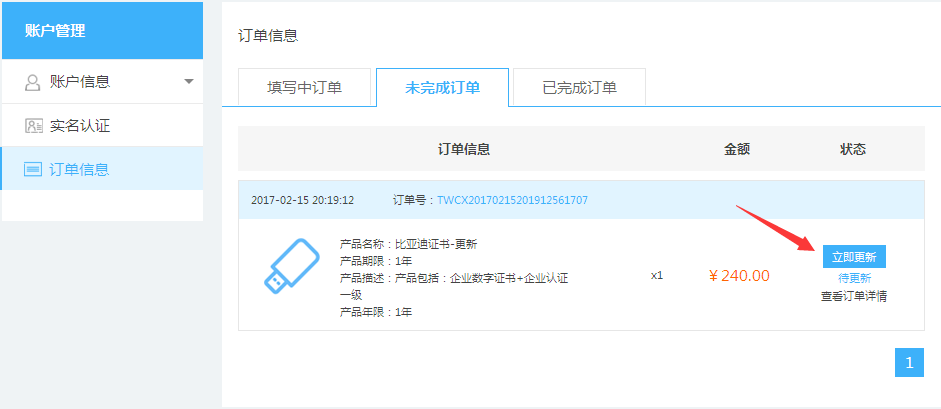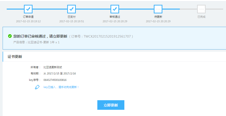 证书更新订单审核通过后,注册的手机号将收到审核通过的短信提示,更新订单状态进入立即更新状态,点击立即更新按钮,进入订单详情