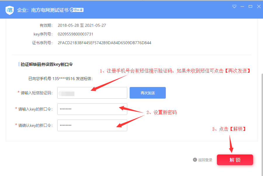 输入验证码、设置新密码后点击【解锁】(备注:如未收到短信,可过半小时后,点击【再次发送】)