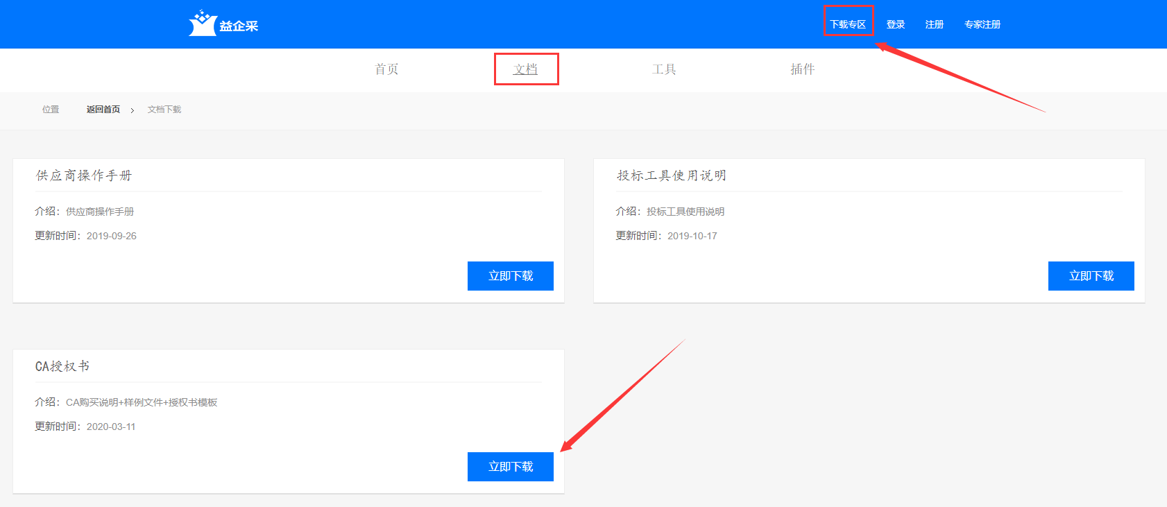 登录投标平台后,点击页面右上方的【下载专区】—【文档】—【CA授权书】—【立即下载】