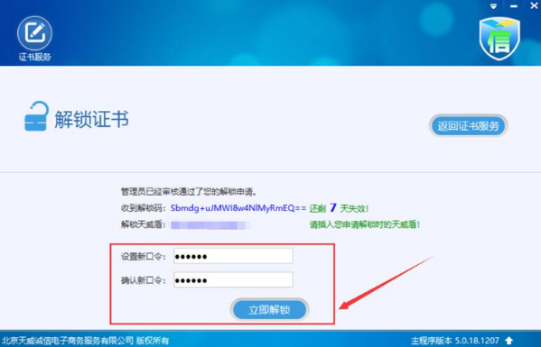 解锁审核专员审批并通过“解锁申请”,在同一台电脑插上USBkey,在I信客户端软件主界面,点击“解锁服务”按钮,进入解锁页面如下图,按页面提示要求,录入新的密码,最后点击“立即解锁”按钮,即可完成解锁。