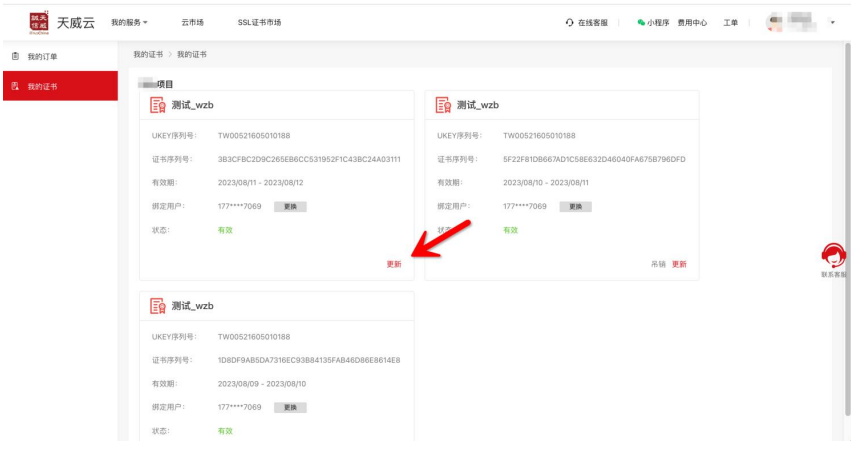 用购买证书的手机号码登录网址:https://www.itruscloud.com/home/#/signMountApp/login?appCode=ycd 登录平台后点击【我的证书】,找到需要更新的证书,点【更新】提交更新的订单