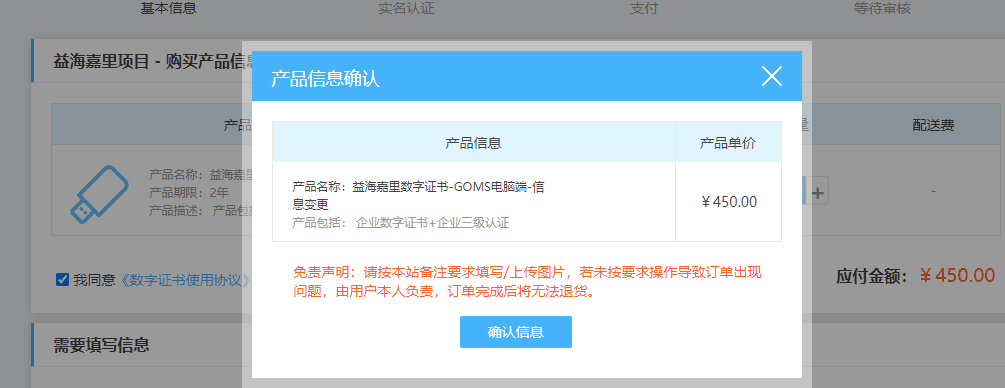 重要提示:请核对产品名称无误后,点击【确认信息】可以在线提交订单 因操作不当导致错误问题,后果由用户本人承担,申请通过后将无法退货!