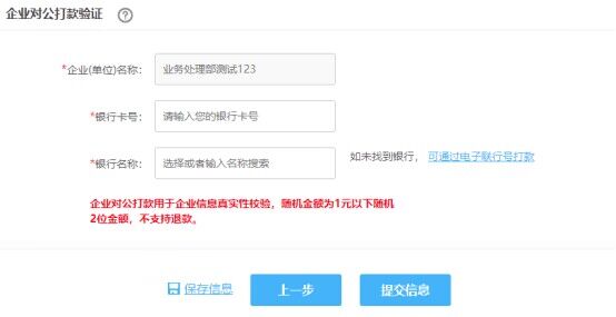 填写企业对公打款验证界面,如未在银行列表找到所需银行,可通过电子联行号打款(企业对公打款用于企业信息真实性校验,随机金额为1元以下随机2位金额,不支持退款。)