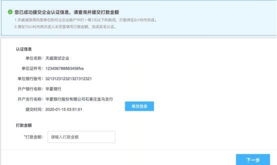 选择完毕后点击 【提交信息】按钮,此时i信系统将会向您的银行卡号中打一笔小于1元的款项,打款在两小时时内完成,需要在72小时内进行打款金额验证。