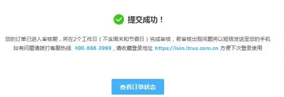 订单提交成功后,可通过网址:https://ixin.itrus.com.cn/点击公司名称进入,点击【我的账户】-【订单管理】中,关注订单状态即可。
