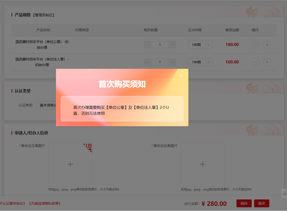 尊敬的国药器材招标采购平台用户:感谢您购买天威诚信公司国药器材招标采购证书。请您按照以下办理指南完成在线订单提交和付款。