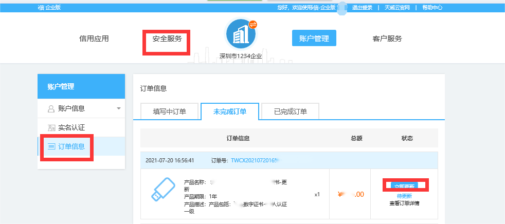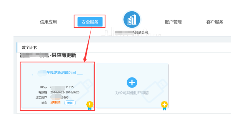 登录成功后,点击公司名称进入,点击【安全服务】,选择需要更新的证书,点击【更新】按钮,提交更新订单即可,订单提交后请您随时关注您的订单状态;