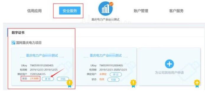 登录成功后,选择【安全服务】后,找到需要更新的证书,点击【更新】