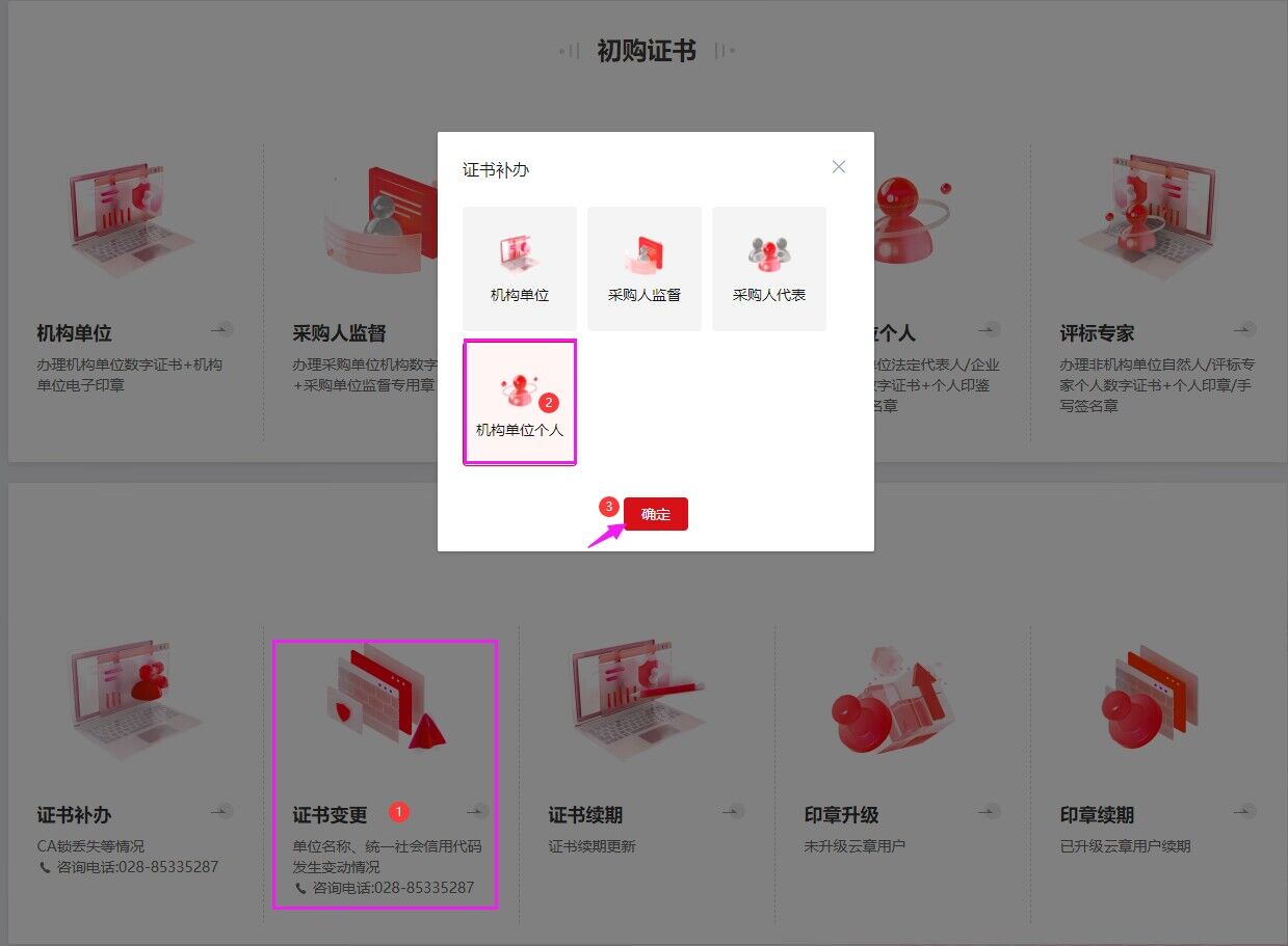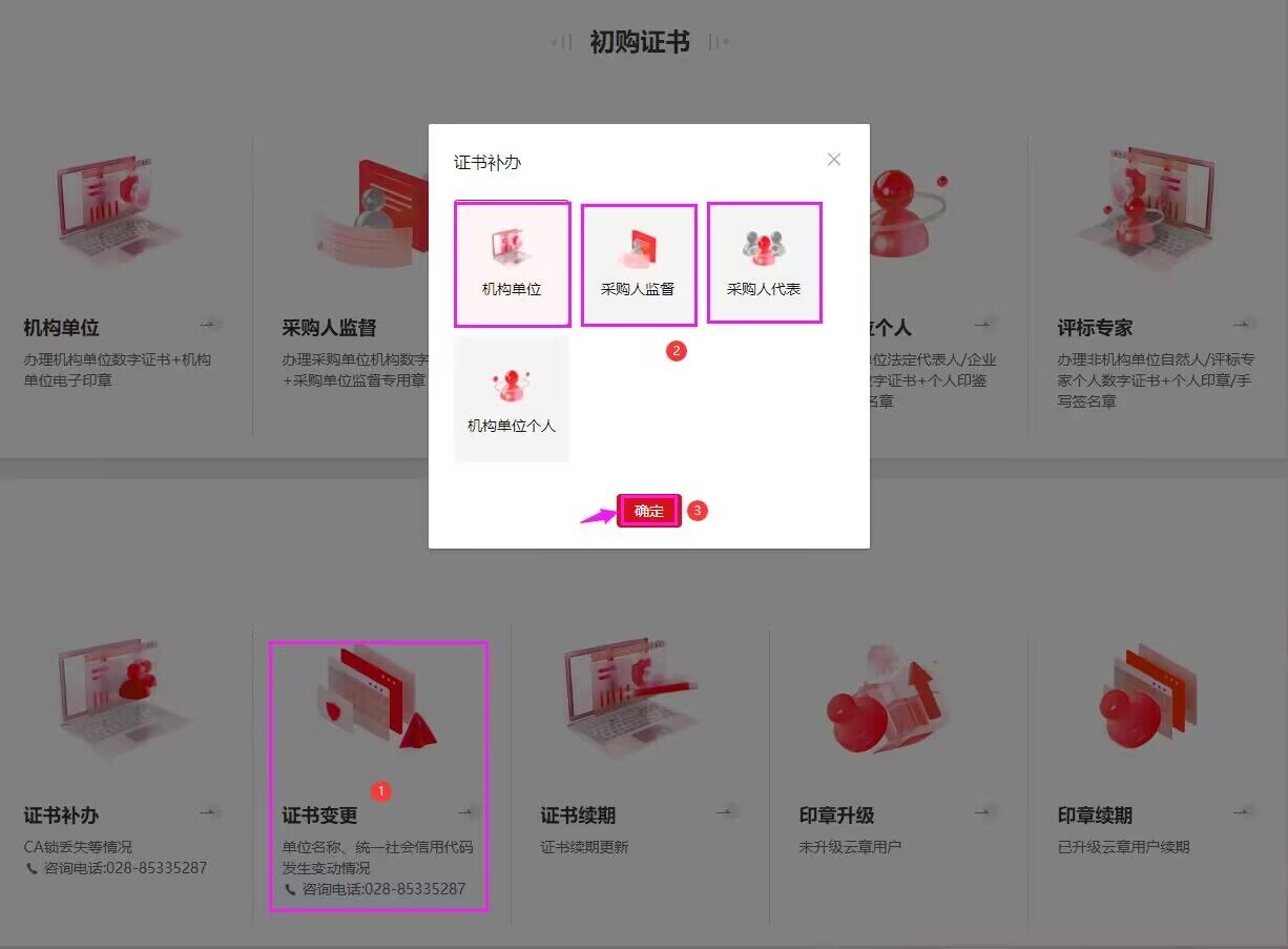 (1)公司名称变更、签章、税号变更:吊销原证书【证书吊销后将无法使用,请您务必确认后谨慎操作!】 办理网址:https://www.itruscloud.com/certsaas_cloud_portal/#/home/sichuan,在【续期操作】项,点【证书变更】按钮后,对应选择【机构单位/采购人监督/采购人代表】后,点确认,在线提交订单;(请根据需求选择对应类型)