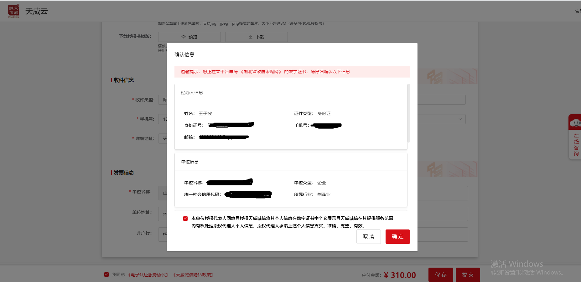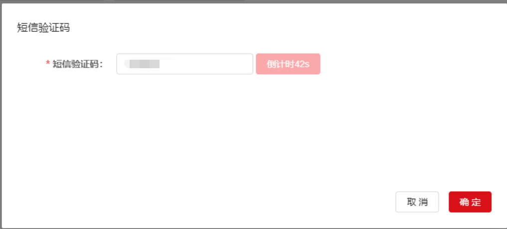 在确认信息框中查看所填写信息是否正确,如有错误可点击“取消”按钮进行修改,如信息正确则需要勾选下方的协议,点击“确定”按钮弹出短信验证框进行验证。