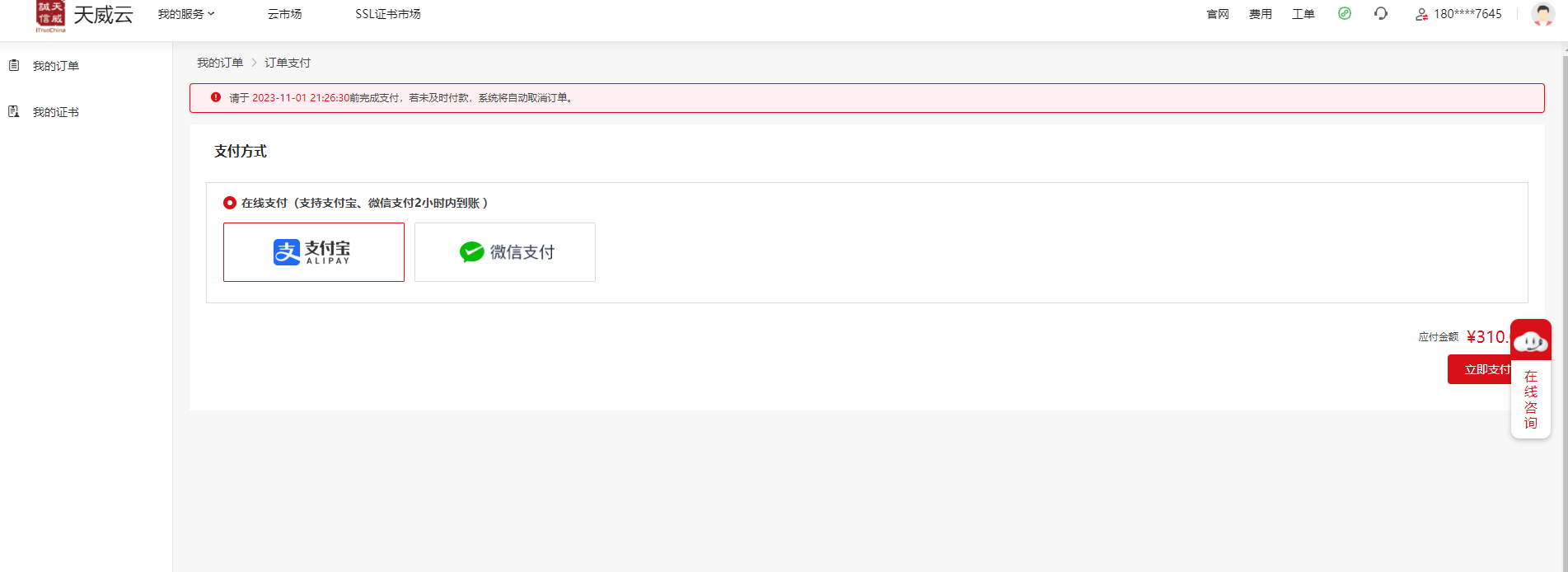 支持支付宝和微信付款方式。在线支付时,选择支付宝点击右下角“立即支付”,扫描页面支付宝二维码即可完成在线付款。
