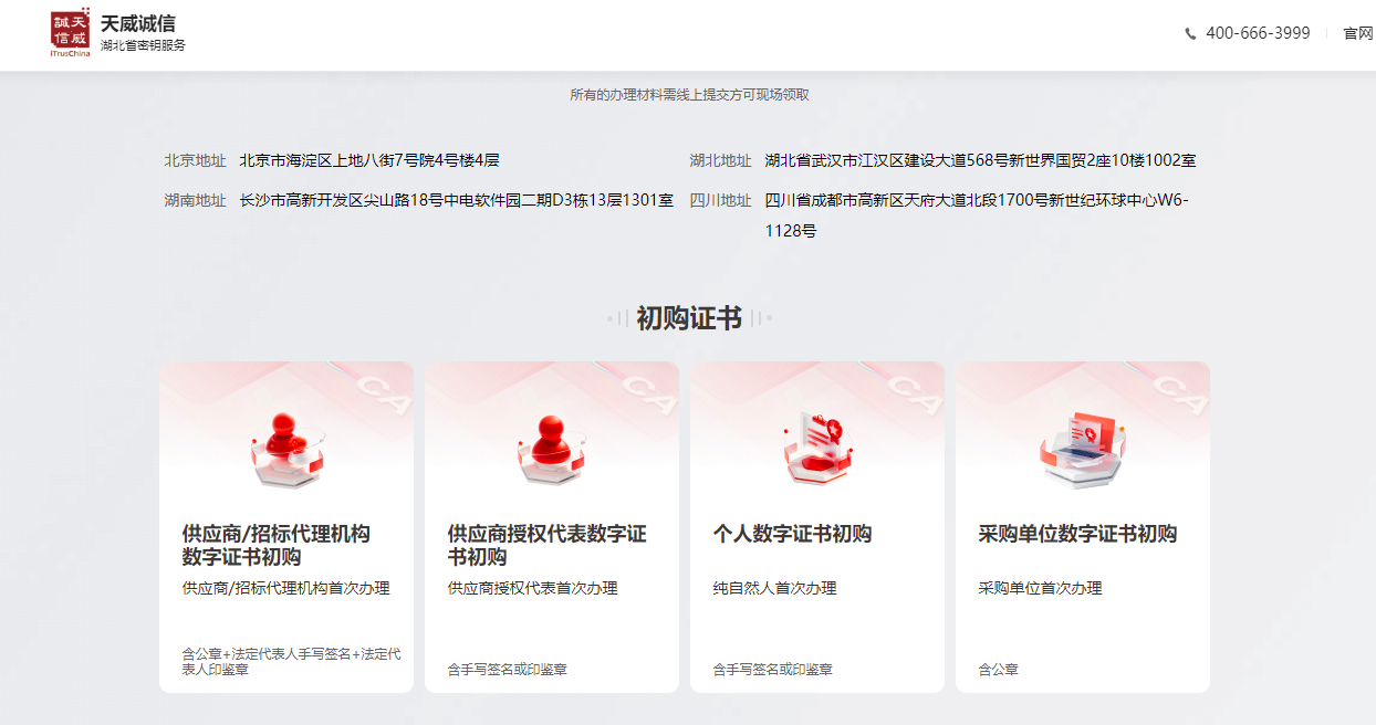 账户成功注册并登录后,点击【前往办理】,选择天威证书办理网址:https://www.itruscloud.com/certsaas_cloud_portal/#/home/hubei 进入订单页面,选择您需要的证书对应办理即可;(注意:申请前,请确认已在【湖北省政府采购电子交易数据汇聚平台】注册账户成功,否则证书将不能正常使用,由此产生的后果请自行承担)