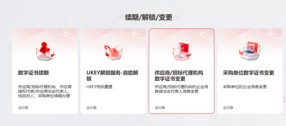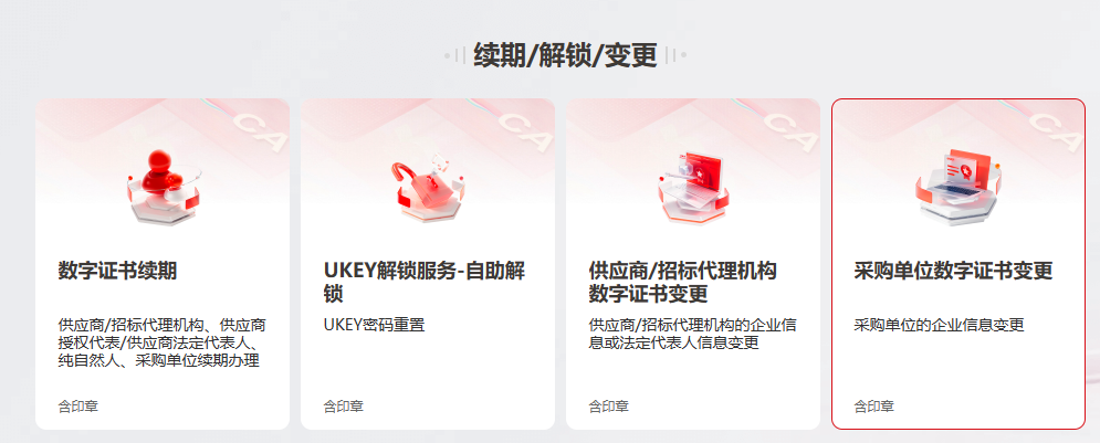 (2)采购单位的企业信息变更:请先吊销原证书,证书吊销后将无法使用,请您务必确认后谨慎操作!办理网址:https://www.itruscloud.com/certsaas_cloud_portal/#/home/hubei 选择【采购单位数字证书变更】提交变更订单