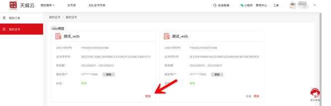 用购买证书的手机号码登录网址:https://www.itruscloud.com/home/#/signMountApp/login?appCode=ycd ,登录平台后点击【我的证书】,找到需要更新的证书,点【更新】提交更新的订单