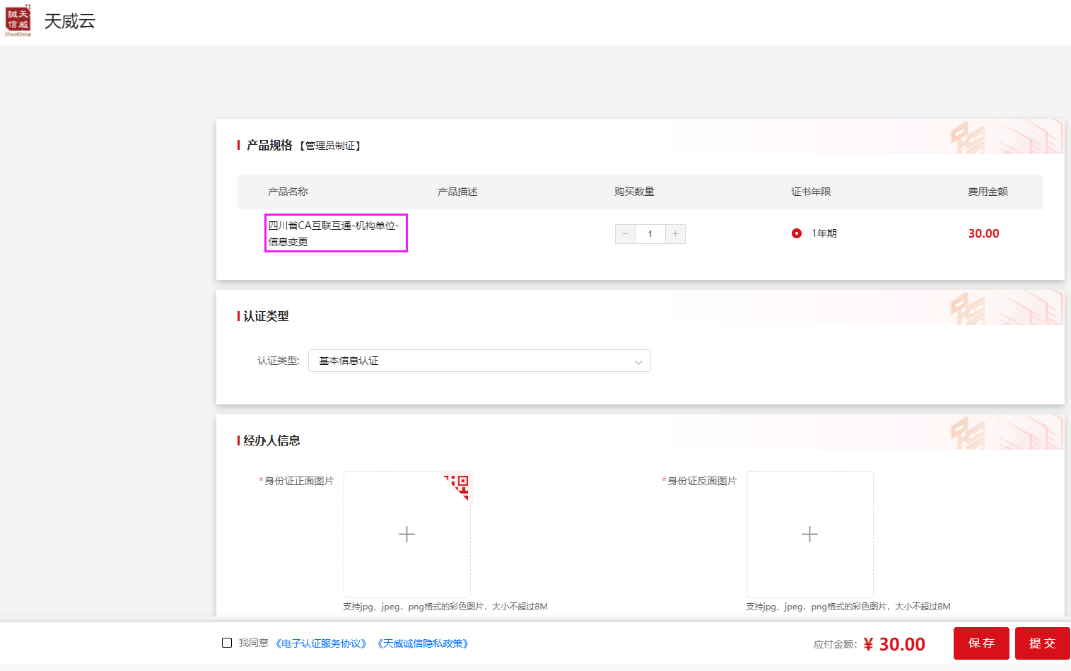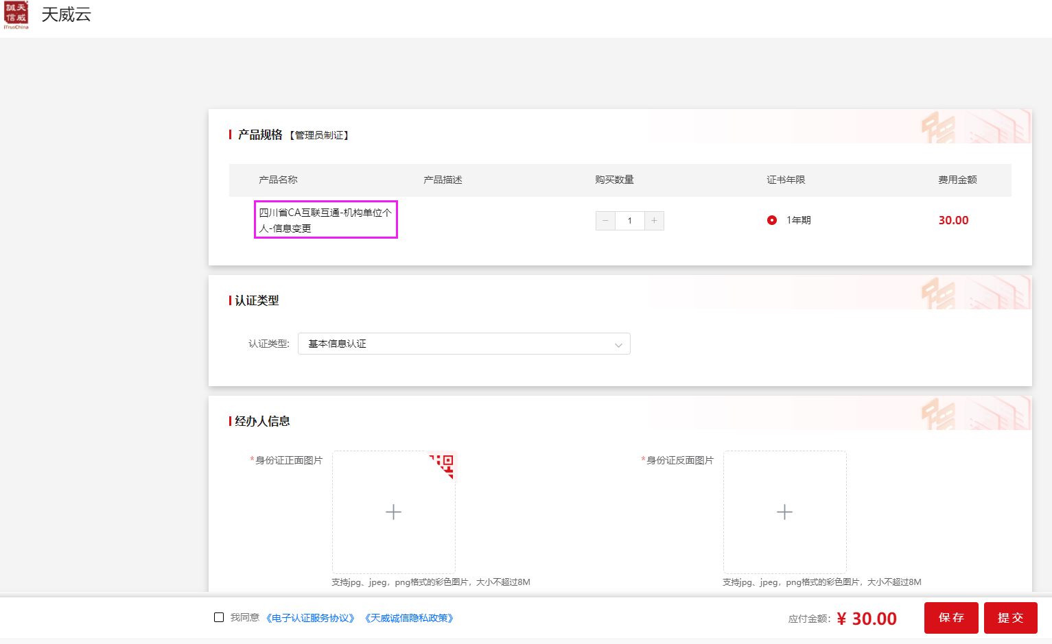 (2)机构单位证书个人证书人员变更、签章变更:吊销原证书 办理网址:https://www.itruscloud.com/certsaas_cloud_portal/#/createOrder?productCode=CERT221595,在线提交订单,订单审核通过后,请寄回或送回U盾到天威进行修改制作;