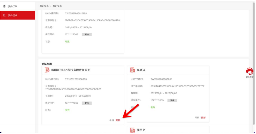 证书有效期小于30天且过期未超过60天, 用经办人的手机号码或者证书登录网址:https://www.itruscloud.com/home/#/signMountApp/login?appCode=ycd,登录平台后点击“我的服务”——“云采盾“按钮,点“我的证书”,找到您要更新的证书,点“更新”按钮提交更新订单