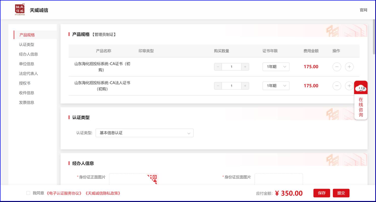 感谢您购买天威诚信公司山东海化招投标项目平台数字证书。请您按照办理指南完成在线订单提交。