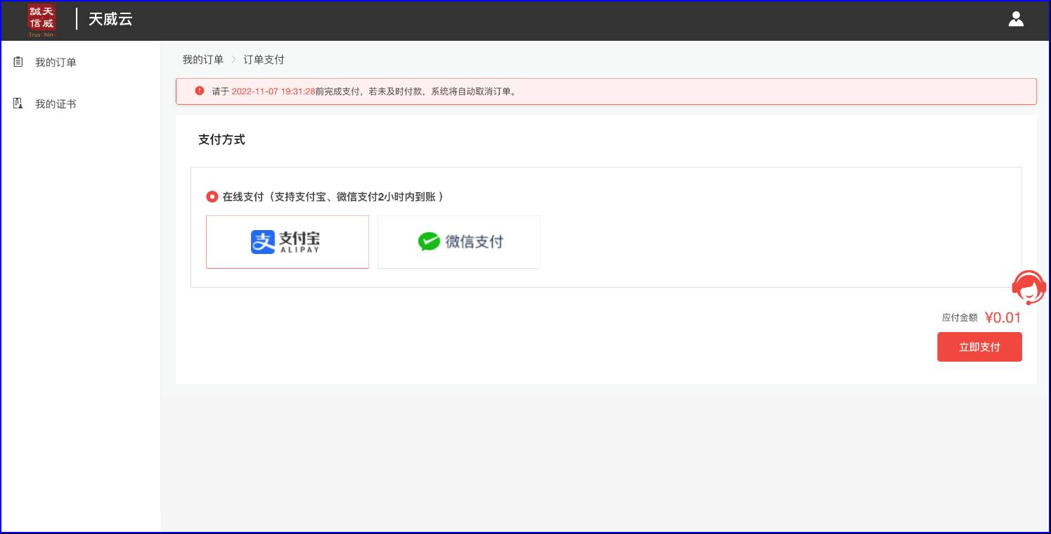 订单修改及查询网址:https://www.itruscloud.com/home/#/signMountApp/login?appCode=ycd, 输入经办人的手机号及验证码登录平台(温馨提示:当时提交订单时接收短信验证码的手机号),点击【我的订单】,可查看当前企业订单状态。