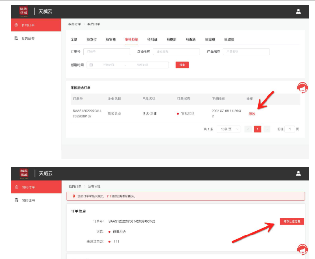 订单修改及查询网址:https://www.itruscloud.com/home/#/signMountApp/login?appCode=ycd输入经办人的手机号及验证码登录平台,点击【我的订单】,可查看当前企业订单状态。如遇订单审核拒绝:进入订单信息后点击“立即修改”,如下图: