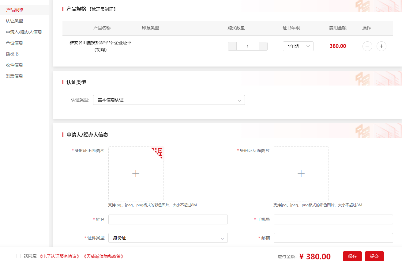 尊敬的雅安名山国投供应商:感谢您购买天威诚信公司雅安名山国投数字证书。请您按照以下办理指南完成在线订单提交和付款。