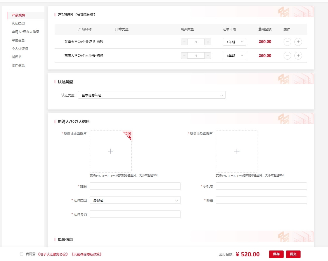 企业证书+个人证书在线办理方式:https://www.itruscloud.com/certsaas_cloud_portal/#/createOrder?productCode=CERT300652,CERT819698注:初次办理证书请办理一套(企业证书+法人证书)