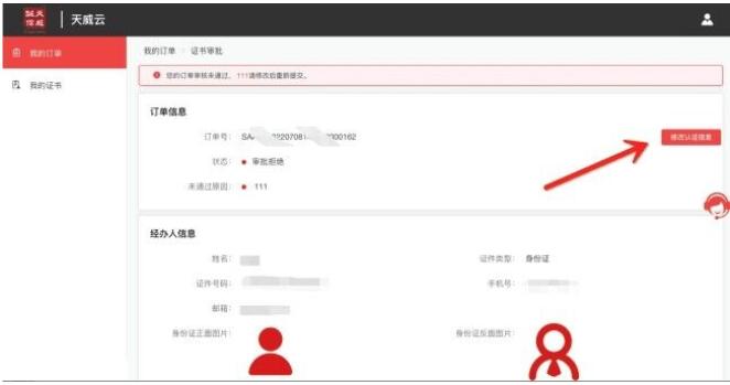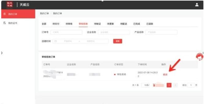 订单修改及查询网址:https://www.itruscloud.com/certsaas_cloud_console/#/login输入经办人的手机号及验证码登录平台 (温馨提示:当时提交订单时接收短信验证码的手机号),点击上方【我的服务】——【云采盾】进入“我的订单”页面,可查看当前企业订单状态。如遇订单审核拒绝:进入订单信息后点击“立即修改”,如下图:
