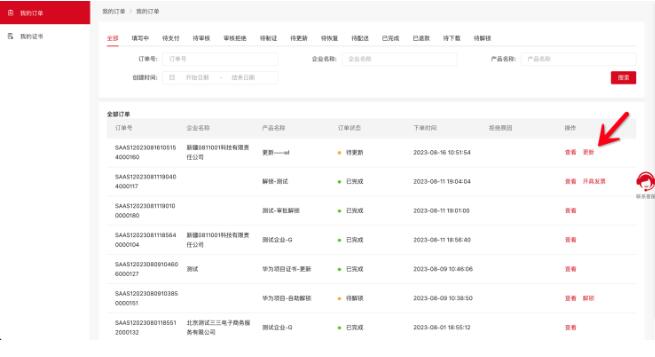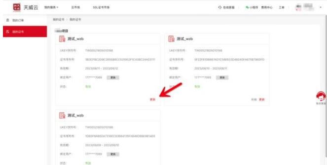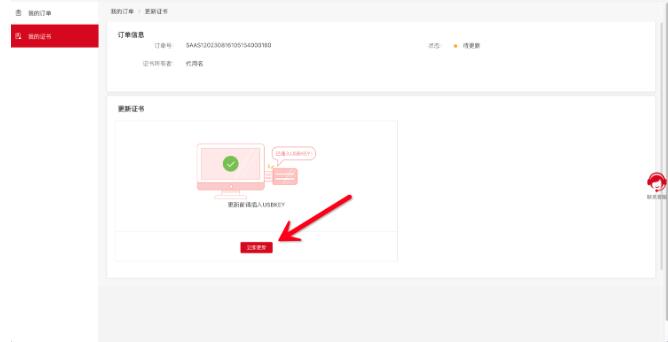 数字证书在到期前30天内或已过有效期未超过60天,请使用购买证书的手机号码登录https://www.itruscloud.com/home/#/signMountApp/login?appCode=ycd 登录平台后点击【我的证书】,找到需要更新的证书,点【更新】提交更新的订单; 审核通过后,请在订单页面,点“更新”按钮更新下载证书即可,请您随时关注您的订单状态。