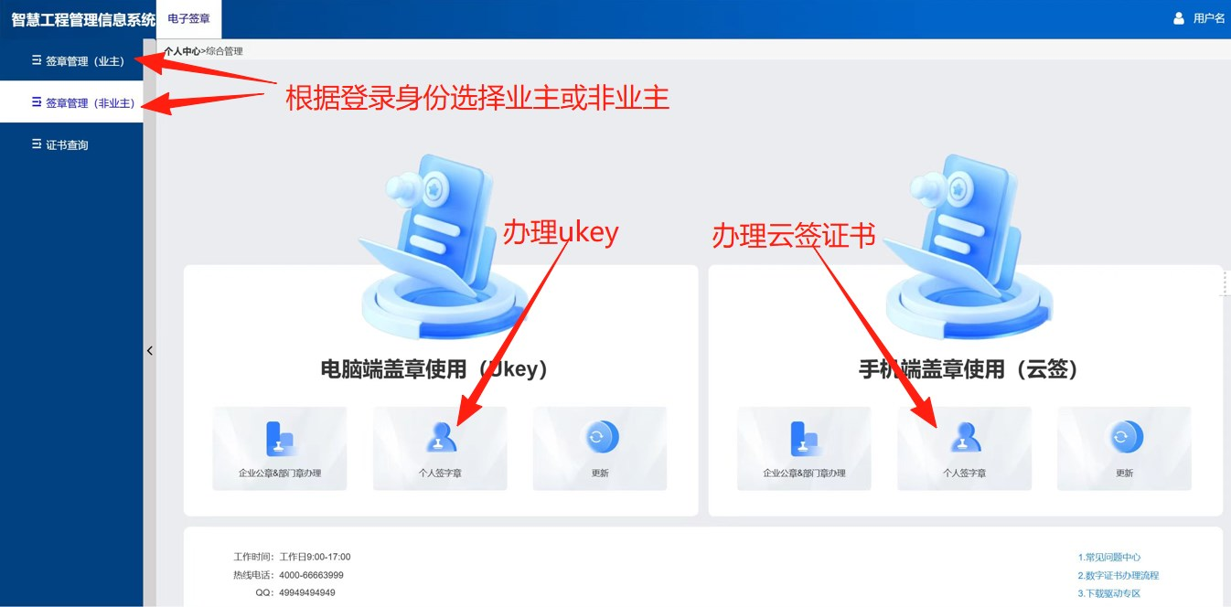 1.填写申请信息 进入申请信息填写页面: 通过链接https://www.zhgkxt.com/login 登录“南方电网智慧工程管理信息系统”。 选择“签章管理(非业主)/签章管理(业主)”,单击页面上的“个人签字章”按钮,系统将跳转到申请信息填写页面; 请根据您的身份及需求自助选择正确的办理入口办理证书