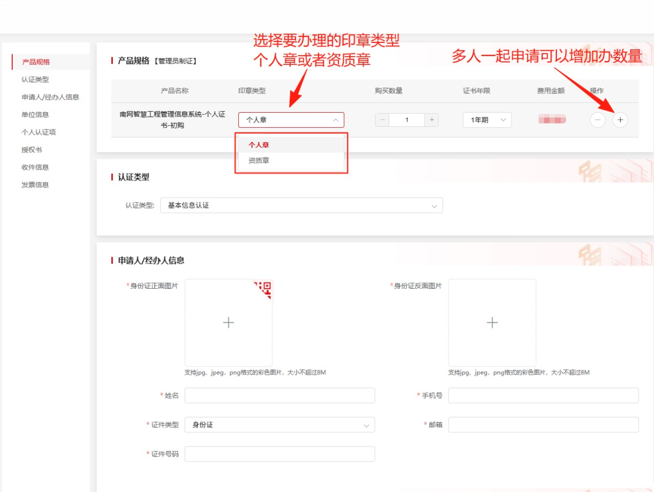 证书年限:购买一年。 购买数量:同一印章类型多人一起办理可以增加多个,最多5个。 经办人信息:填写经办人的姓名,手机号(提交订单后可通过手机号进行登录),输入电子邮件、证件类型、证件号码、身份证正/反面图片,点击右上角二维码按钮可通过手机号扫码上传。