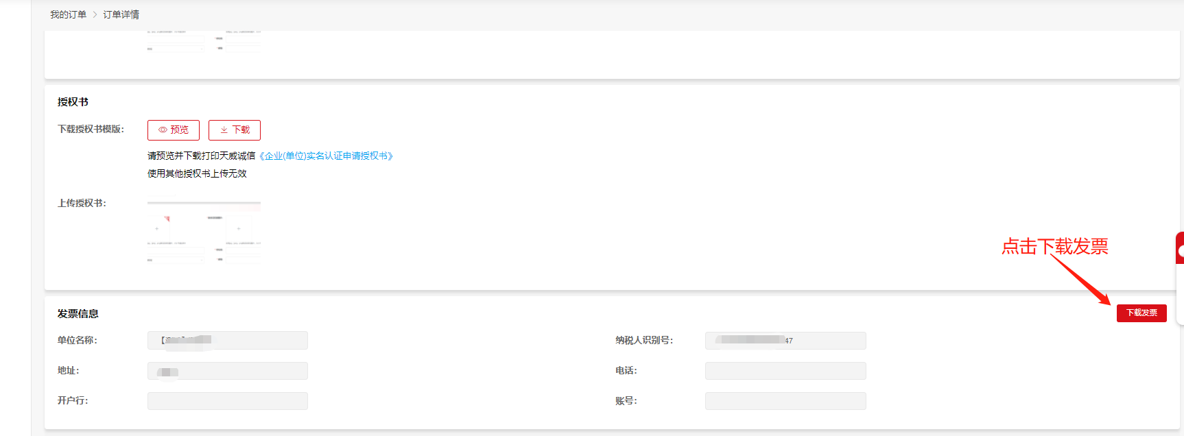 发票下载:输入经办人手机号及验证码登录网址:https://www.itruscloud.com/home/#/signMountApp/login?appCode=ycd,在【我的订单】——【已完成】订单中,点击查看按钮,在订单中下载发票。