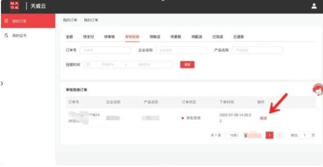 订单修改及查询网址:https://www.itruscloud.com/certsaas_cloud_console/#/login,输入经办人的手机号及验证码登录平台 (温馨提示:当时提交订单时接收短信验证码的手机号),点击上方【我的服务】——【云采盾】进入“我的订单”页面,可查看当前企业订单状态。如遇订单审核拒绝:进入订单信息后点击“立即修改”,如下图: