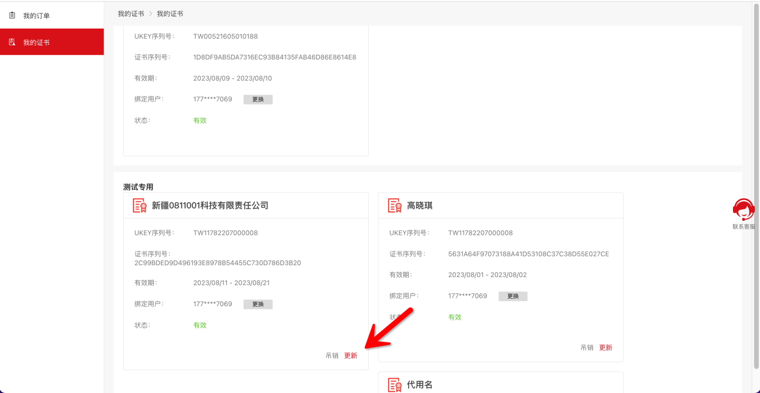 证书有效期小于30天且过期未超过30天,用经办人的手机号码及验证码登录网址:https://www.itruscloud.com/home/#/signMountApp/login?appCode=ycd,登录平台后点击【我的证书】,找到需要更新的证书,点【更新】提交更新的订单, 审核通过后,请在订单页面,点“更新”按钮更新下载证书即可,请您随时关注您的订单状态。