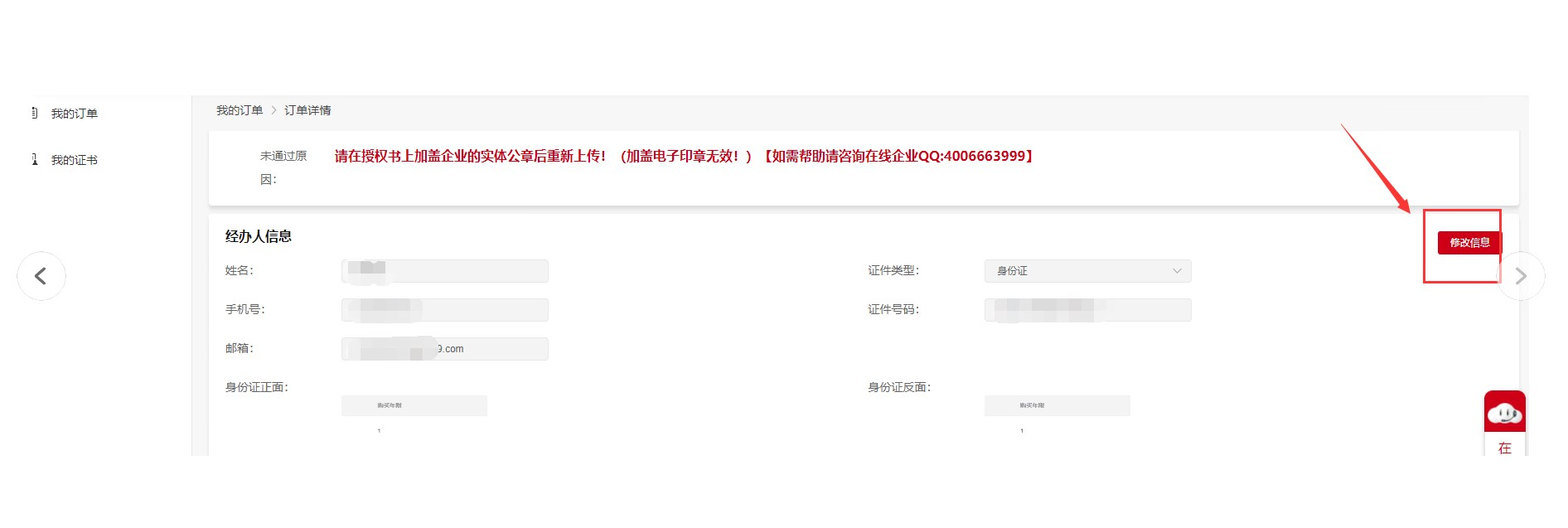在【经办人信息】右侧点击【修改信息】按钮,按审核意见修改后重新提交此订单,关注订单状态。