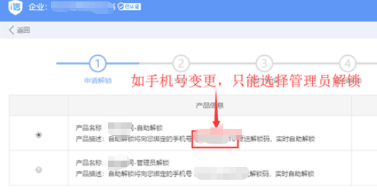 可以选择【自助解锁】或【管理员解锁】 注:如果手机号【未绑定】或手机号变更,只能选择管理员解锁