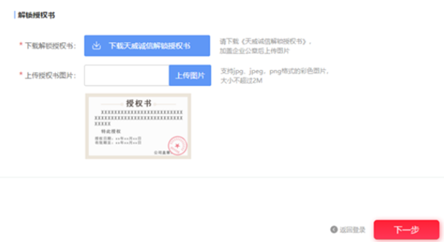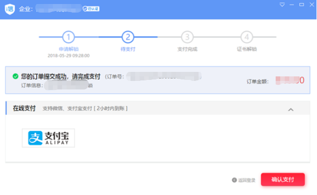 选择【管理员解锁】方式后,提交解锁订单,授权书需加盖企业公章,选择支付方式,完成支付。解锁费用:100元/次