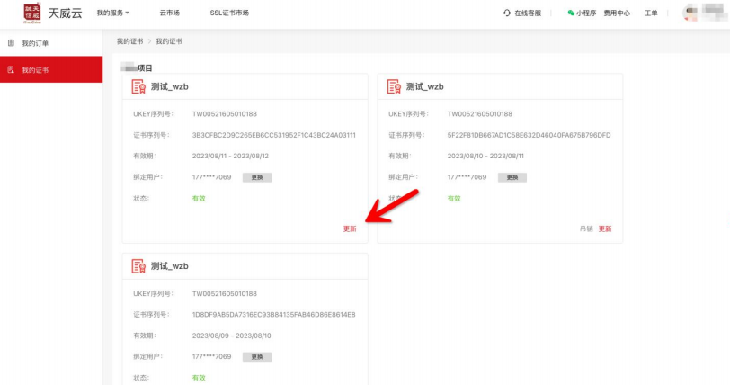 数字证书在到期前30天内或已过有效期未超过60天,请使用购买证书的手机号码登录https://www.itruscloud.com/home/#/signMountApp/login?appCode=ycd 登录平台后点击【我的证书】,找到需要更新的证书,点【更新】提交更新的订单; 审核通过后,请在订单页面,点“更新”按钮更新下载证书即可,请您随时关注您的订单状态。