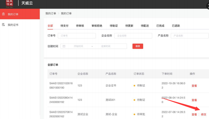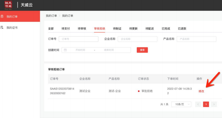 订单修改及查询网址:https://www.itruscloud.com/certsaas_cloud_console/#/login输入经办人的手机号及验证码登录平台 (温馨提示:当时提交订单时接收短信验证码的手机号),点击上方【我的服务】——【云采盾】进入“我的订单”页面,可查看当前企业订单状态。如遇订单审核拒绝:进入订单信息后点击“立即修改”,如下图: