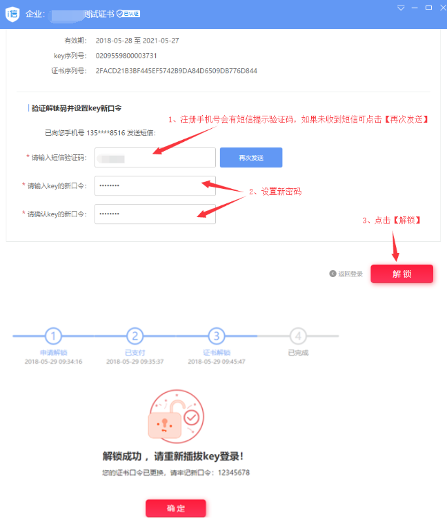 输入验证码、设置新密码后点击【解锁】(备注:如未收到短信,可过半小时后,点击【再次发送】)